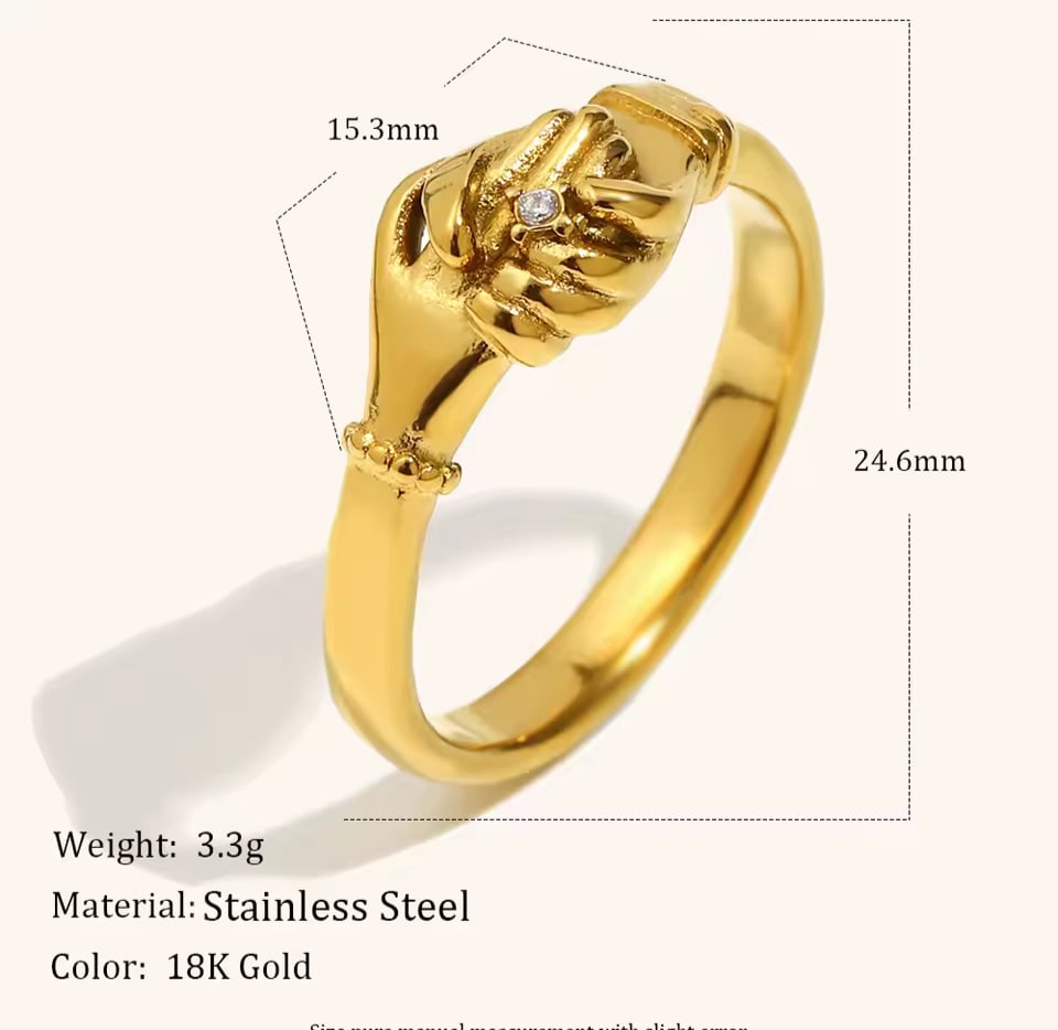 Crafted in a radiant gold finish, this unique ring features two detailed hands coming together in a timeless handshake design, accented with a subtle sparkling stone for just the right touch of shine. Whether it represents friendship, love, or self-commitment, this piece carries meaning with every wear.